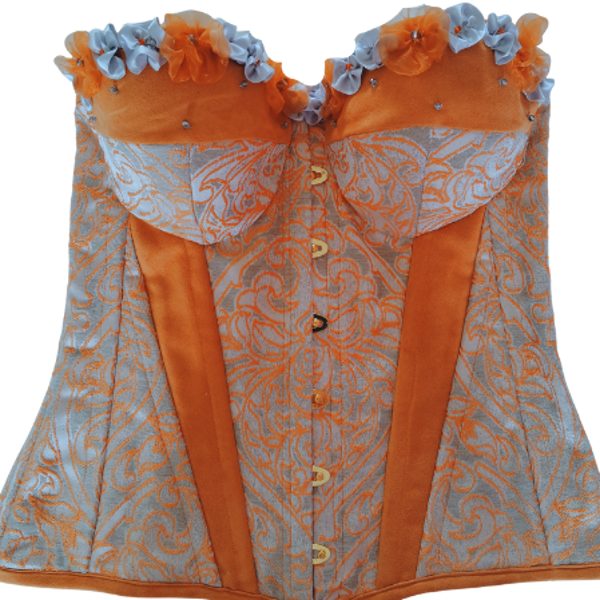 A beautiful silver brocade with burnt orange design, teamed with a plain plain burnt orange fabric. Suitable for either the Cupped Corset or the Corded Mid Bust Corset.